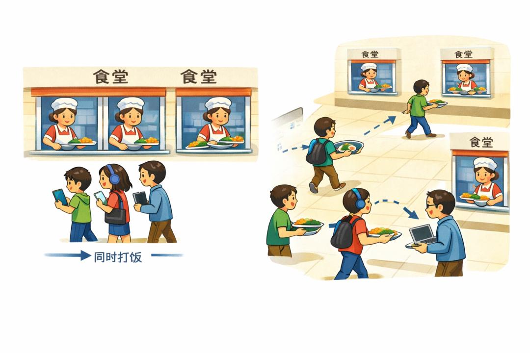 就好比原本食堂只有一个窗口一个打饭阿姨,要吃饭得排队,现在新增了好几个,同学们可以同时打到饭。