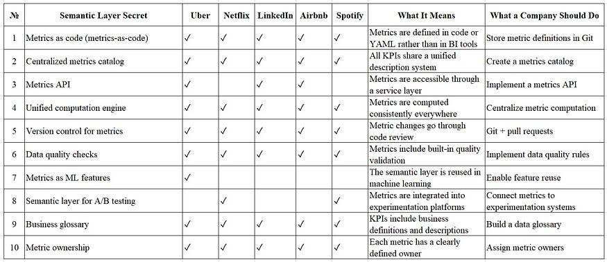 商业智能供应商将其作为一种便捷的指标模型进行销售。现代数据架构称之为指标层。人工智能团队则声称,如果没有它,就无法构建分析代理。但如果你仔细观察一下主要科技公司(Uber、Netflix、Airbnb、LinkedIn、Spotify)的架构,就会发现它们的含义与“语义层”一词通常所暗示的含义截然不同。