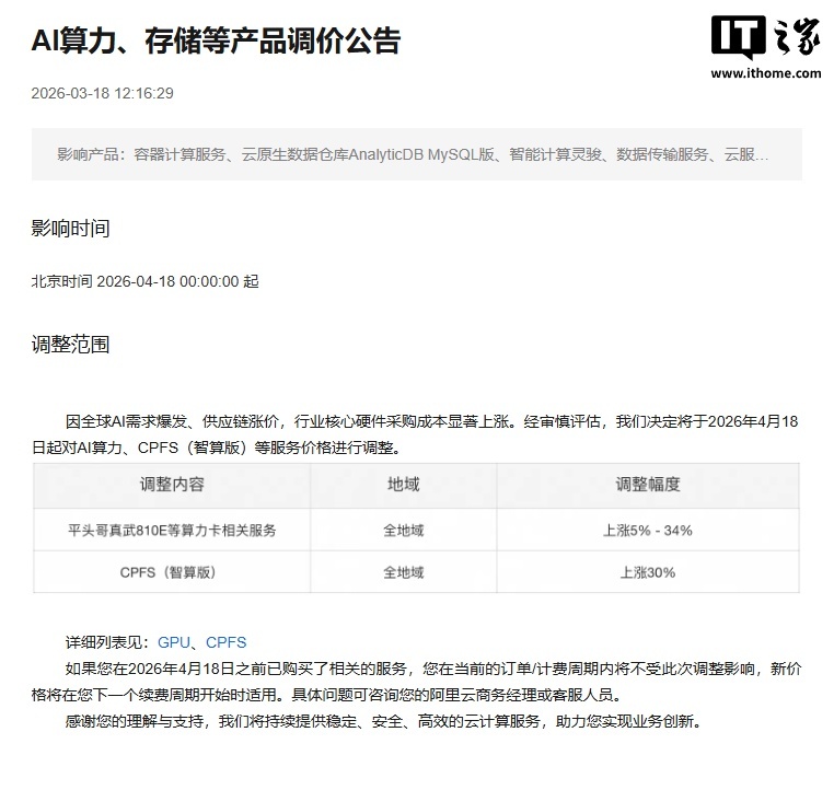 因全球 AI 需求爆发、供应链涨价,行业核心硬件采购成本显著上涨。经审慎评估,阿里云决定于 2026 年 4 月 18 日起对 AI 算力、CPFS(智算版)等服务价格进行调整。