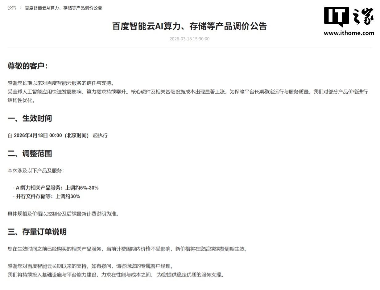 其中,AI 算力相关产品服务:上调约 5%-30%;并行文件存储等:上调约 30%。上述价格自 2026 年 4 月 18 日 00:00(北京时间)起执行。