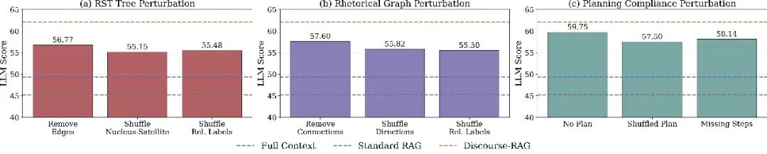 光加规划没用,必须加结构。给普通RAG加一个通用规划步骤(不含篇章结构),提升很有限。而Disco-RAG的大幅提升主要来自“论证树+关系网”这套结构化表示。说明模型确实在利用文本的逻辑结构,而不是单纯因为输入变长了。