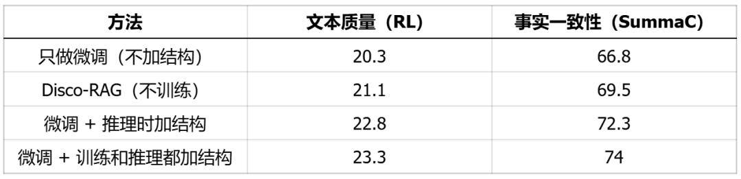 既然Disco-RAG不用训练就能提效,那如果叠加训练会怎样?团队在SciNews摘要任务上做了对比: