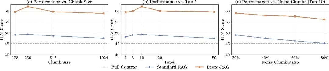 面对噪声和粒度变化,依然稳健。即使把大量检索结果替换成无关内容,或者大幅调整段落切分粒度,普通RAG波动剧烈,Disco-RAG始终保持稳定表现。