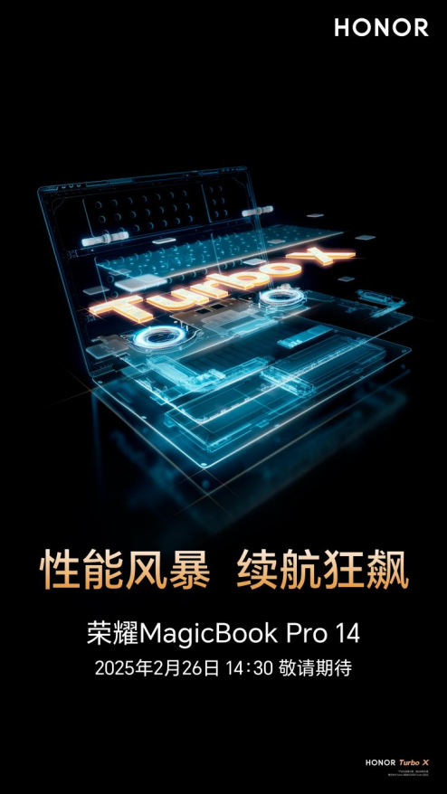IT之家 2 月 18 日消息,2 月 18 日,荣耀官宣笔记本新品荣耀 MagicBook Pro 14 将于 2 月 26 日发布,搭载新一代底层调校技术 HONOR Turbo X,号称“性能风暴、续航狂飙”。