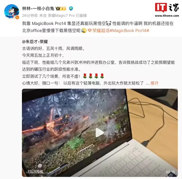 根据相关爆料,荣耀 MagicBook Pro 14 笔记本的续航能力“极其出色”,甚至可以媲美 MacBook。