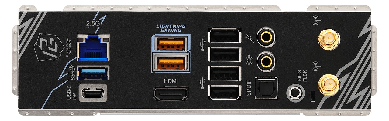 1× HDMI、2× USB-A 10Gbps、1× USB-C 10Gbps(支持 DP Alt,搭配特定处理器时支持 USB4)、4× USB 2.0 Type-A、1× USB-A 5Gbps、1× 2.5GbE RJ45、1× SPDIF-Out、2× 音频插孔。