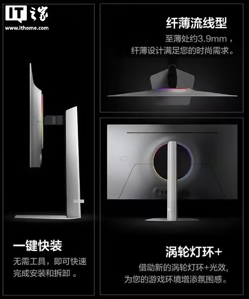 这款显示器支架支持倾斜 / 升降 / 旋转,官方暂时没有公布这款显示器的完整 I/O 信息,仅知悉该机将配备 HDMI 2.1 / DP / USB-C 接口,支持 KVM / PIP 功能。