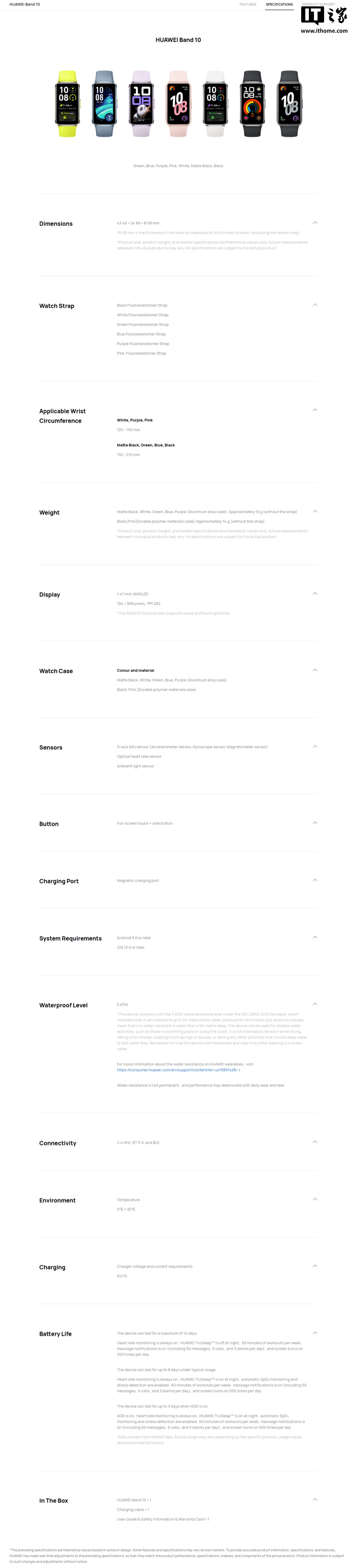 华为手环 10 提供绿、蓝、紫、粉、白、哑光黑、黑 7 种配色,尺寸为 43.45 × 24.86 × 8.99mm,配备 1.47 英寸 AMOLED 屏幕(分辨率 194×368、PPI 282、支持滑动和触摸手势)。