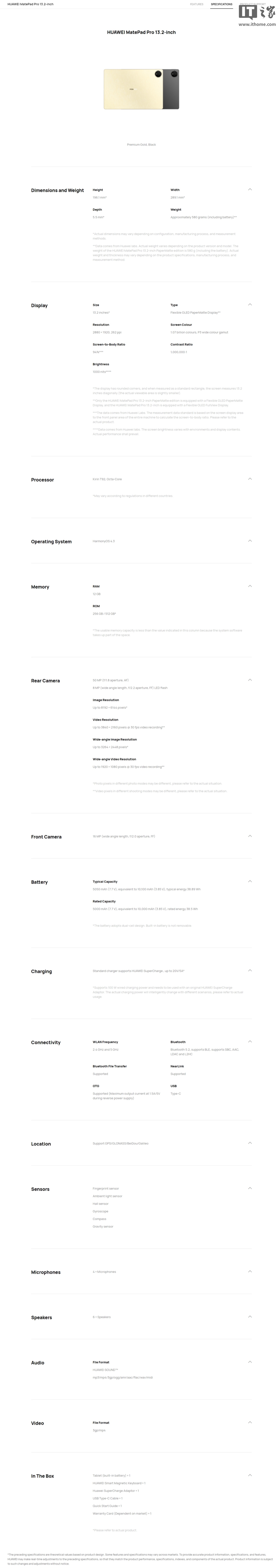 该款平板预装鸿蒙 HarmonyOS 4.3 系统,后置 50MP(主摄)+ 8MP(超广角)、前置 16MP 镜头,提供 12GB 内存和 256GB / 512GB 存储。新款 MatePad Pro 13.2 平板内置 10,100mAh 电池(双电芯设计),支持 100W 快充。