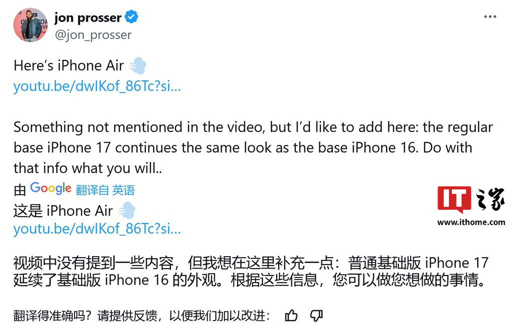 IT之家 2 月 19 日消息,YouTube 频道 Front Page Tech 主播 Jon Prosser 在曝光 iPhone 17 Pro 和 iPhone 17 Air 渲染图后,昨日在 X 平台发布推文,透露苹果 iPhone 17 标准版将沿用旧款设计,意味着今年 iPhone 17 系列会有 3 种设计方案。