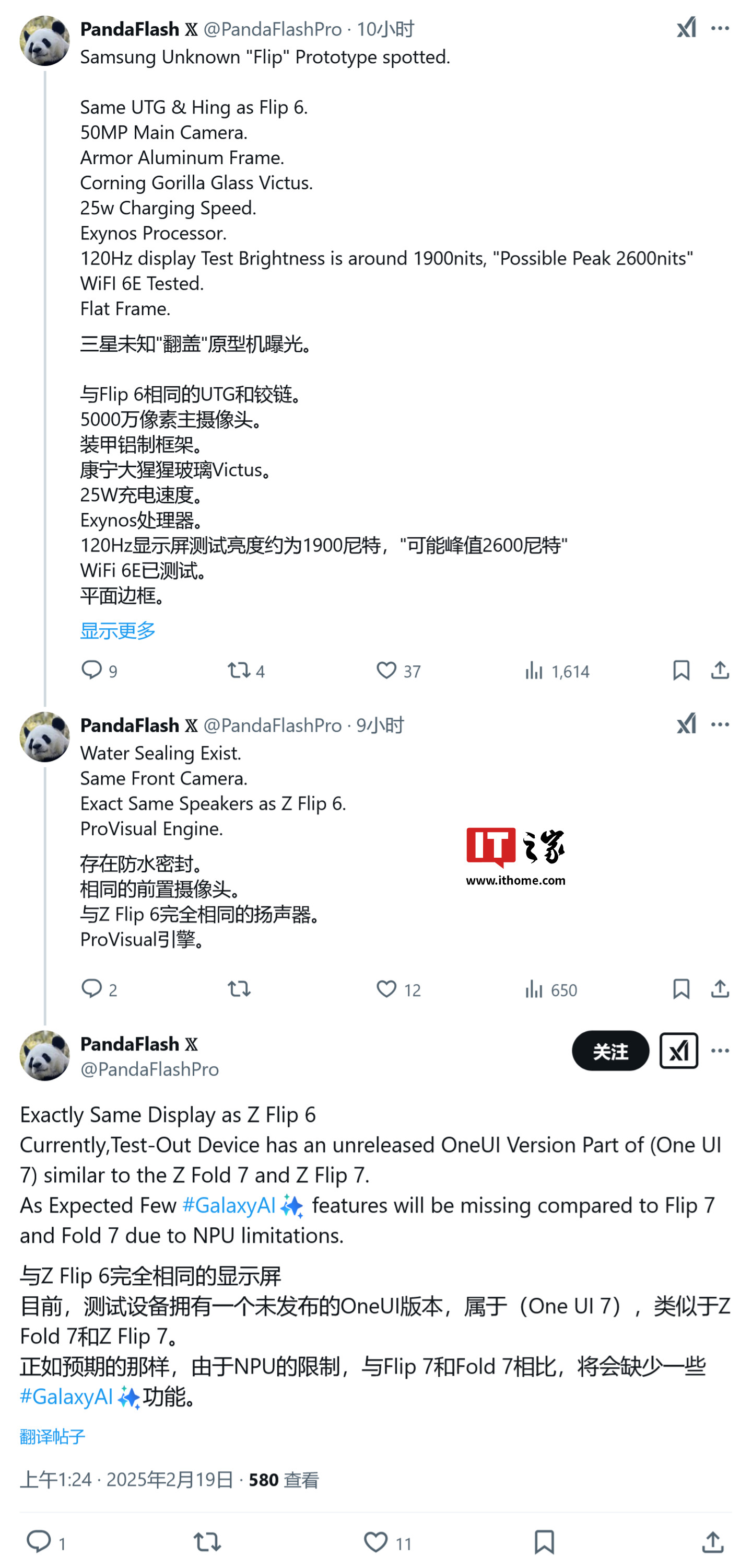 IT之家 2 月 19 日消息,消息源 PandaFlashPro 昨日(2 月 18 日)在 X 平台发布推文,分享了三星小折叠手机原型规格,暗示为今年发布的 Galaxy Z Flip FE 手机。