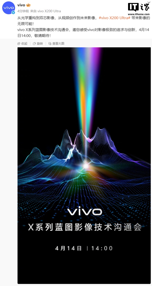 IT之家 4 月 11 日消息,vivo X 系列蓝图影像技术沟通会将于 4 月 14 日 14:00 举行:“从光学重构到双芯影像,从视频创作到未来影像,vivo X200 Ultra 带来影像的无限可能!”