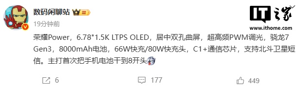IT之家 4 月 11 日消息,荣耀 Power 手机将于 4 月 15 日发布,博主 @数码闲聊站 今日曝光了这款新机的主要参数。