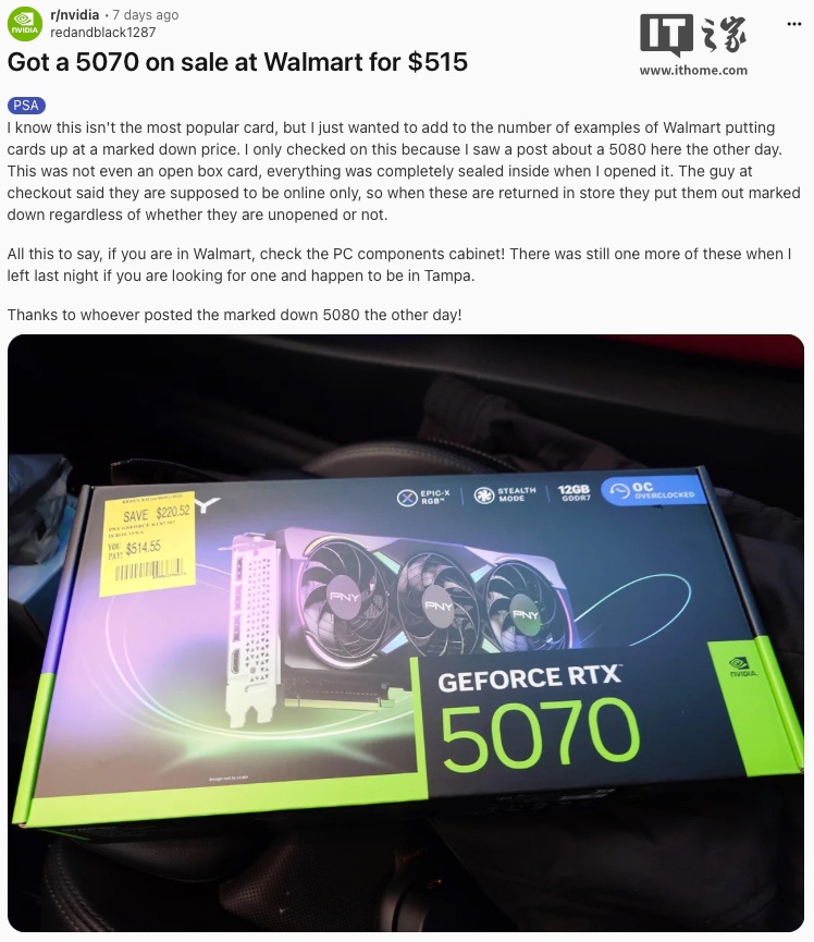 第二位玩家 redandblack1287 分享道,他在家附近的沃尔玛清仓区发现了一张 PNY RTX 5070 显卡,标价 515 美元(现汇率约合 3771 元人民币),他看到该显卡并未拆封,询问工作人员后得知该显卡为退货品,即使未拆封也会按照退货标准销售;随后他表示,同款显卡在亚马逊等第三方平台至少溢价到了 829 美元(现汇率约合 6070 元人民币)以上,如按溢价算折扣为 6.1 折左右,所以他最后将其收入囊中。