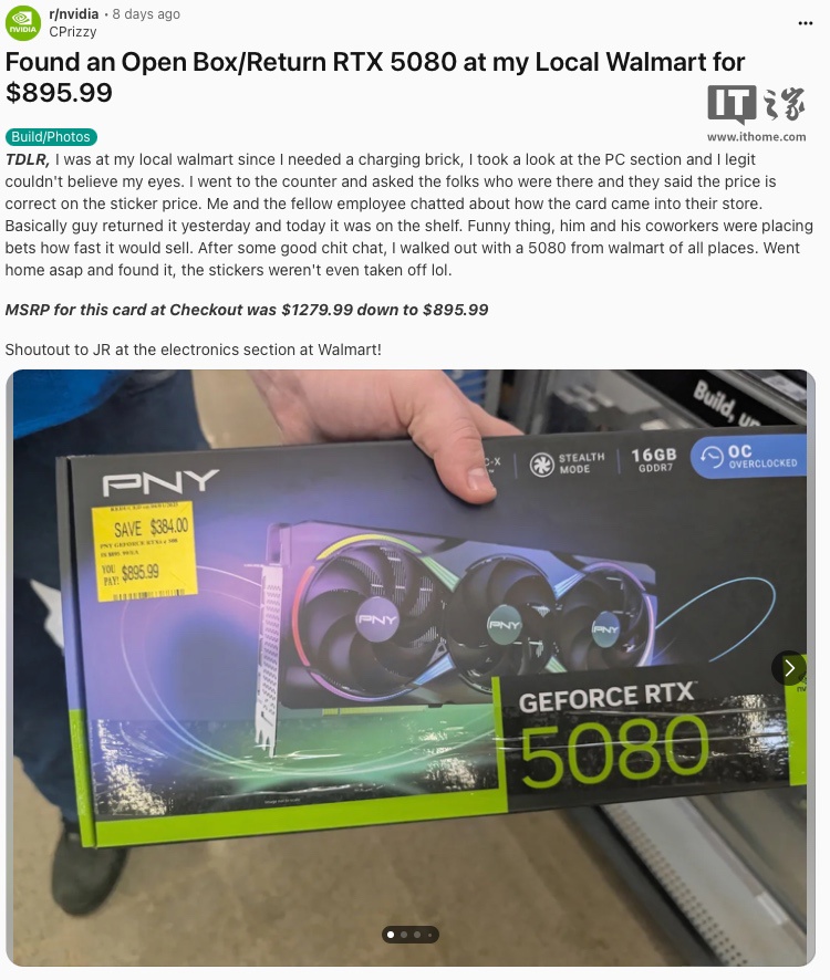 第一位玩家 CPPrizzy 分享道,他在美国得克萨斯州的沃尔玛买充电宝时,瞄了一眼清仓区,没想到看到一张 PNY RTX 5080 显卡,最后他以 895.99 美元(现汇率约合 6561 元人民币)的价格购入,原价 1279.99 美元(现汇率约合 9372 元人民币),相当于打 7 折;购买后他将这张显卡装上电脑,进行跑分测试等,截至目前一切正常。