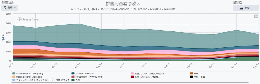 2024年字节游戏的收入堆叠图(不含国内安卓收入),来源:SensorTower
