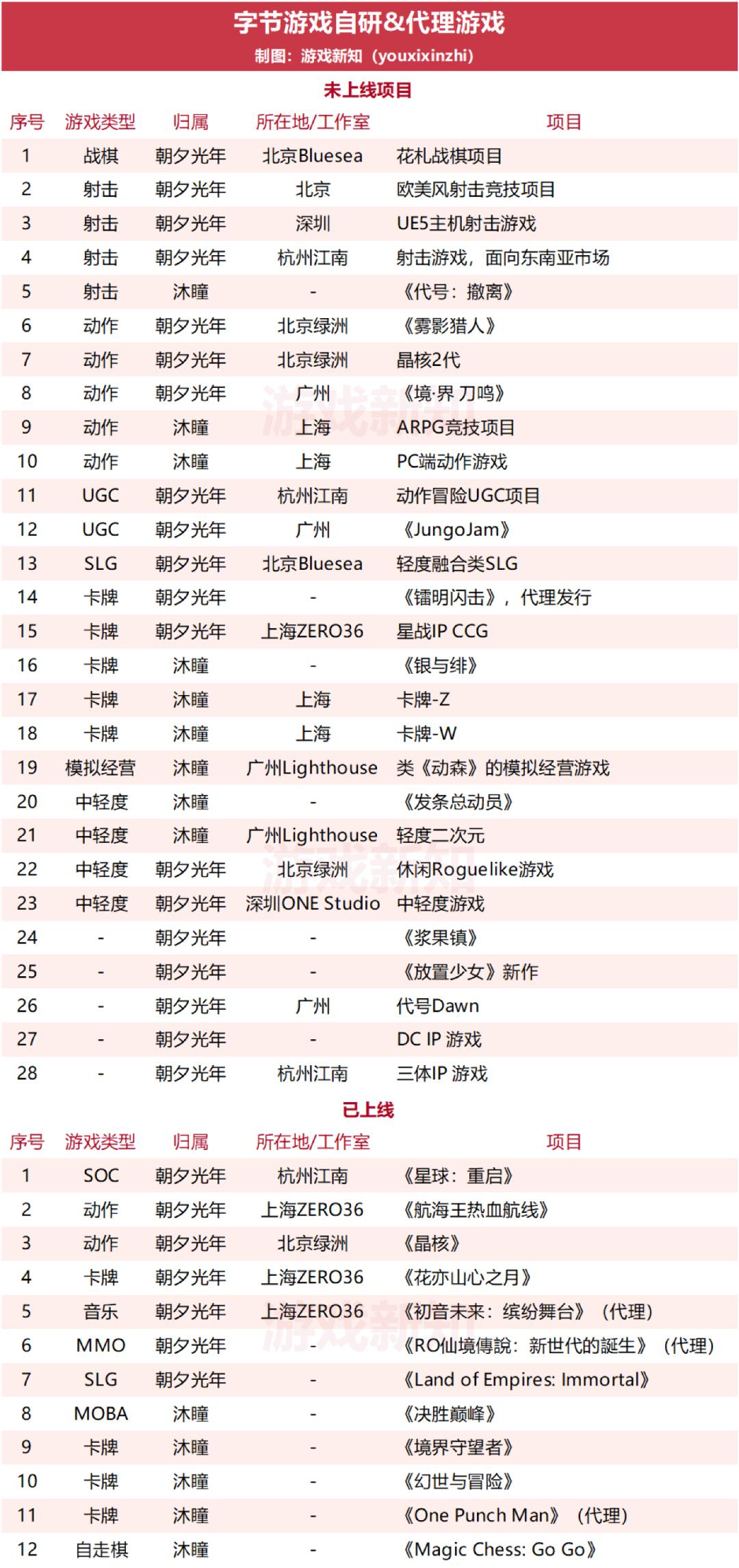 已上线的游戏包括《决胜巅峰(Mobile Legend:BangBang,MLBB)》《潮汐守望者》《放置少女》《晶核》《航海王热血航线》《星球:重启》等。其中出海是字节游戏比较重要的板块,《MLBB》在东南亚市场、《放置少女》在日本市场都有比较不错的成绩。国内市场则是朝夕光年的动作游戏《航海王热血航线》《晶核》最为突出。