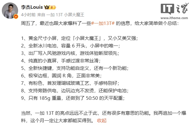 IT之家 4 月 11 日消息,一加中国区总裁李杰今日发文,对一加 13T 手机的部分信息进行了总结,并称“这个月一定让大家都能买得到”。