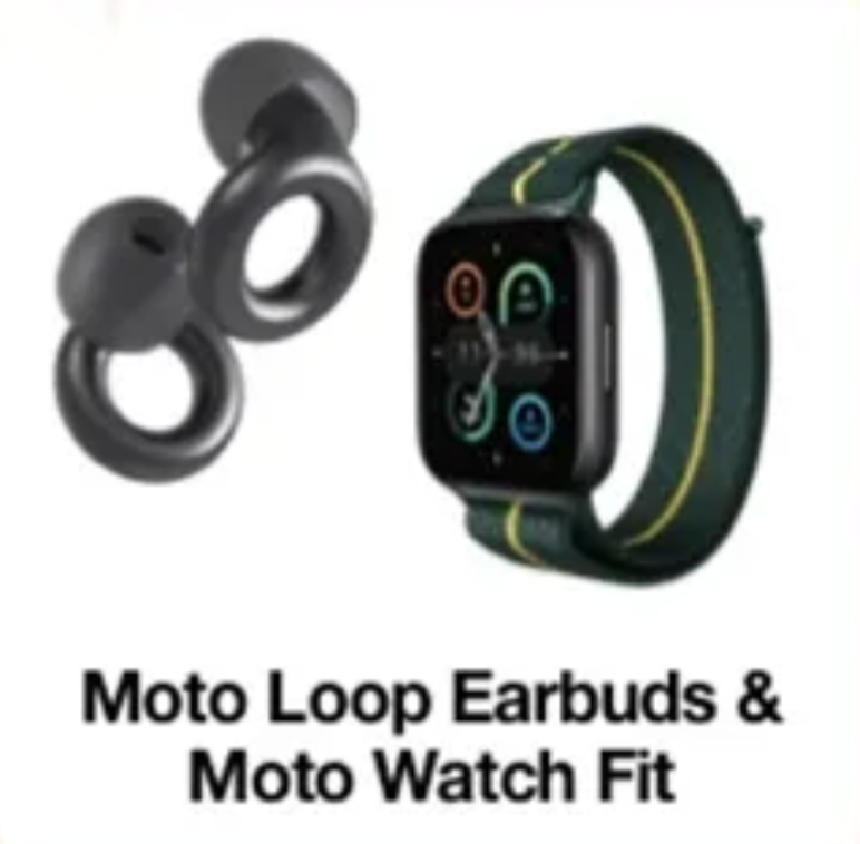 其中,moto Loop Earbuds 为入耳式蓝牙耳机,采用装饰风格环形设计,整体采用哑光灰风格配色;而 moto Watch Fit 智能手表侧面带有按键,配有黄绿风格编织表带,整体风格类似 moto 曾经推出的 Watch 70 智能手表。