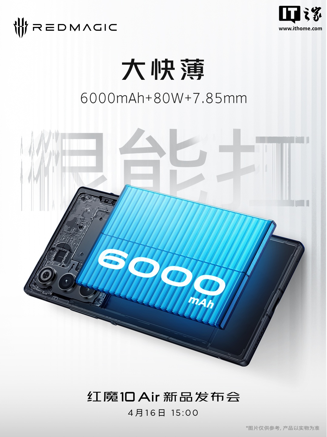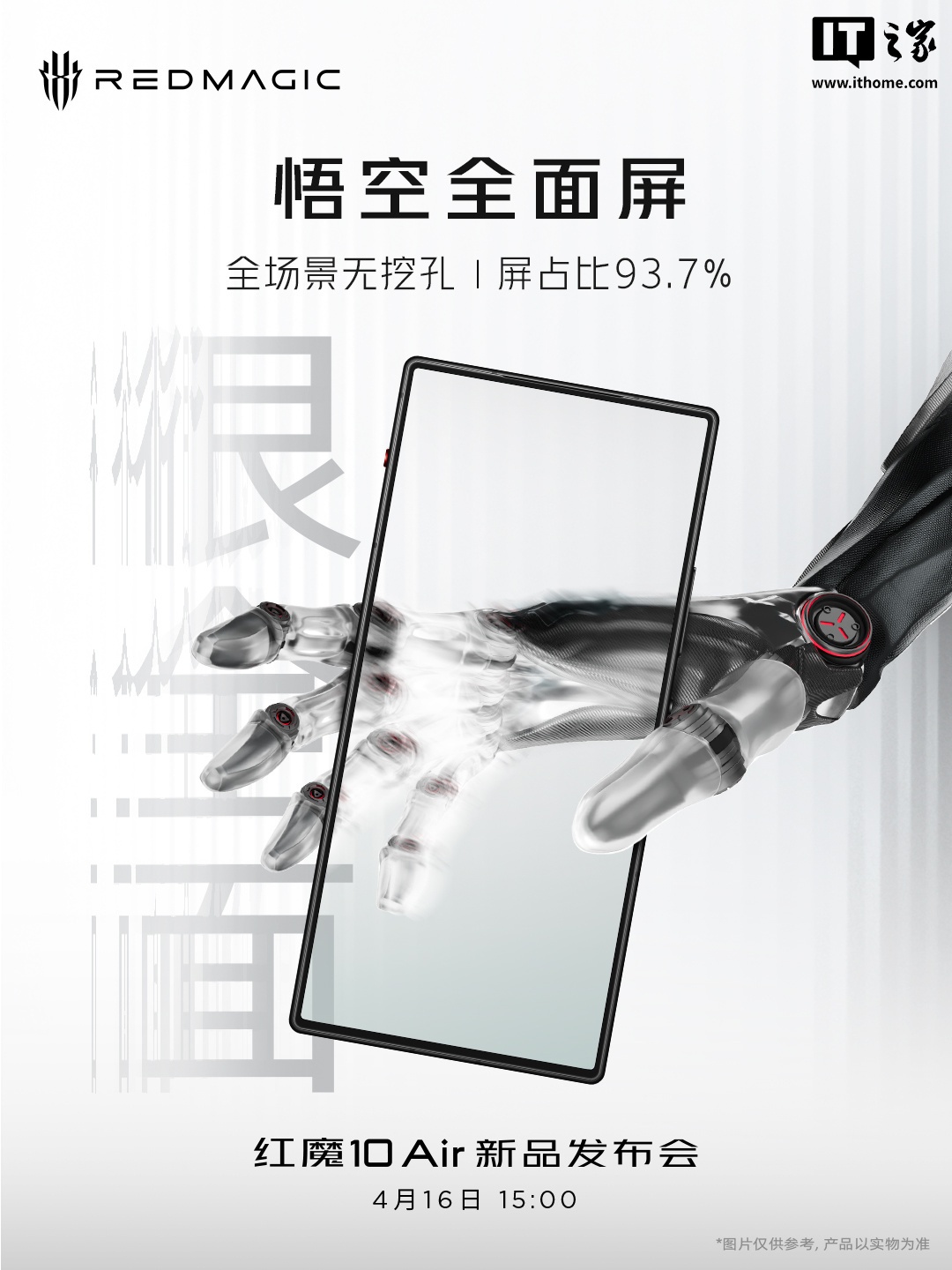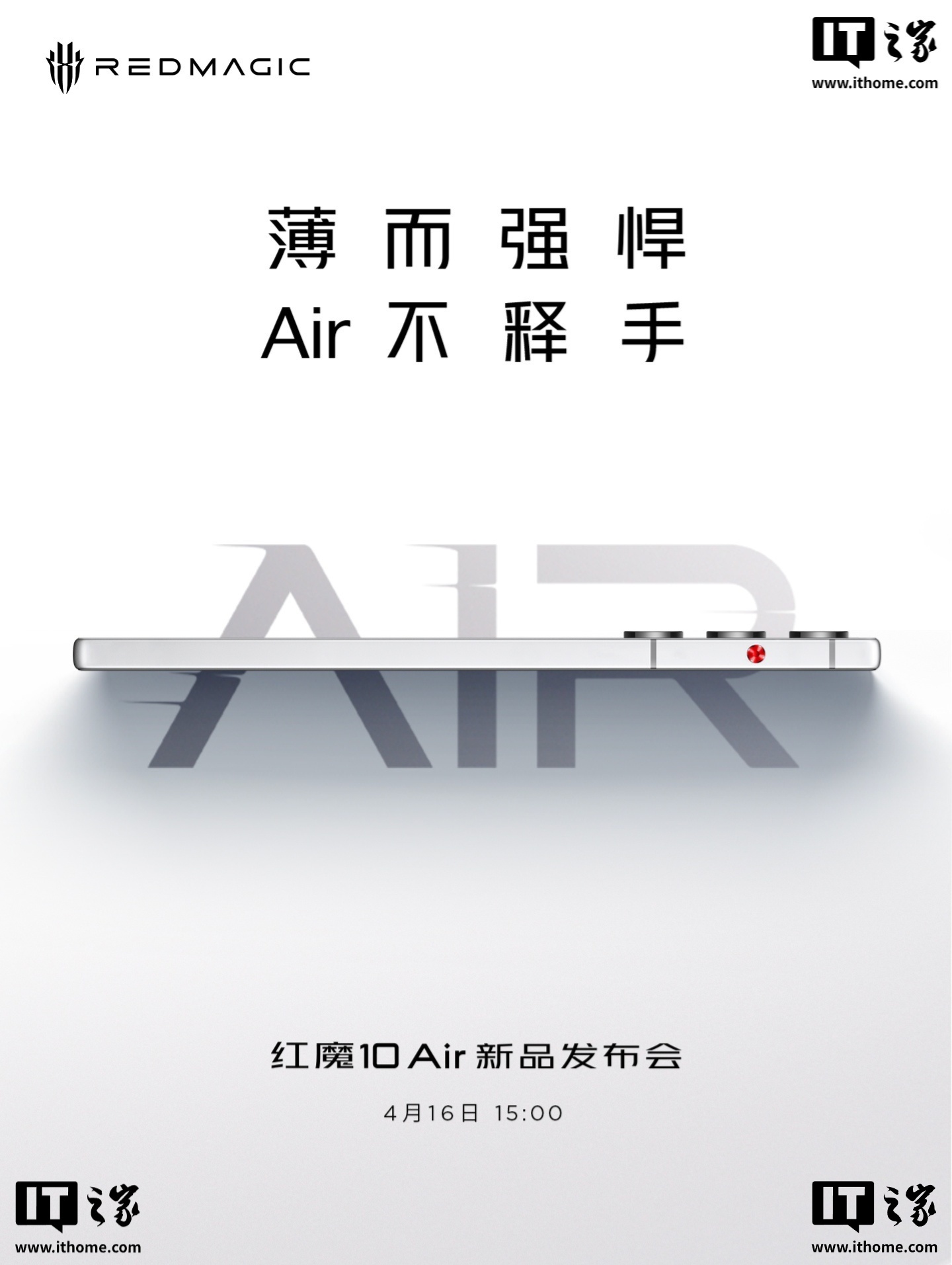 IT之家 4 月 12 日消息,红魔 10 Air 新品发布会已官宣定档 4 月 16 日 15:00,新机将搭载骁龙 8 Gen3 处理器、配备 LPDDR5X+UFS4.0,支持 CUBE 性能 AI 调度引擎和定海神帧技术。