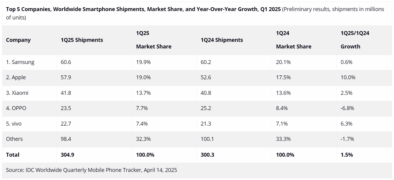 根据国际数据公司(IDC)全球季度手机追踪报告的初步数据,2025年第一季度全球智能手机出货量同比增长1.5%,达到3.049亿部。