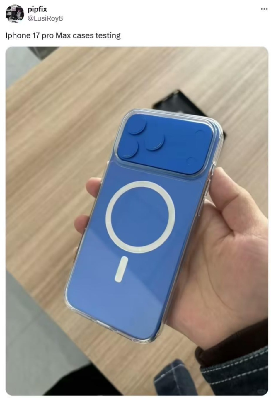 凤凰网科技讯 (作者/彭坤苹)4月15日,博主pipfix(@lusiRoy8)4月14日在X平台发布推文,分享了一组苹果iPhone 17 Pro Max的机模与手机壳组合照片,配文为“iPhone 17 Pro Max外壳测试”。照片中,iPhone 17 Pro Max背部设计格外吸睛,约三分之一的区域被超大摄像头模组所占据,配备了“横向大矩阵”。