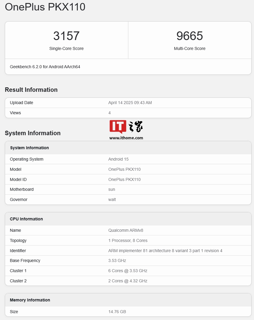 IT之家 4 月 15 日消息,科技媒体 xpertpick 昨日(4 月 14 日)发布博文,报道称一加 13T 手机现身 GeekBench 跑分库,配备高通骁龙 8 至尊版芯片和 16GB 内存,6.2.0 版单核 3157 分,多核 9665 分。
