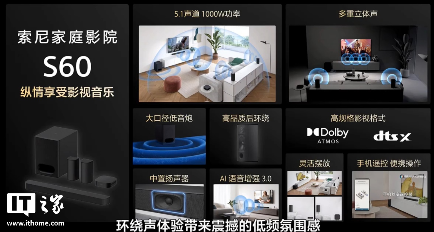 索尼家庭影院 S60 搭载 5.1 声道 1000W 功率,配有大口径低音炮、中置扬声器,支持灵活摆放、多重立体声。