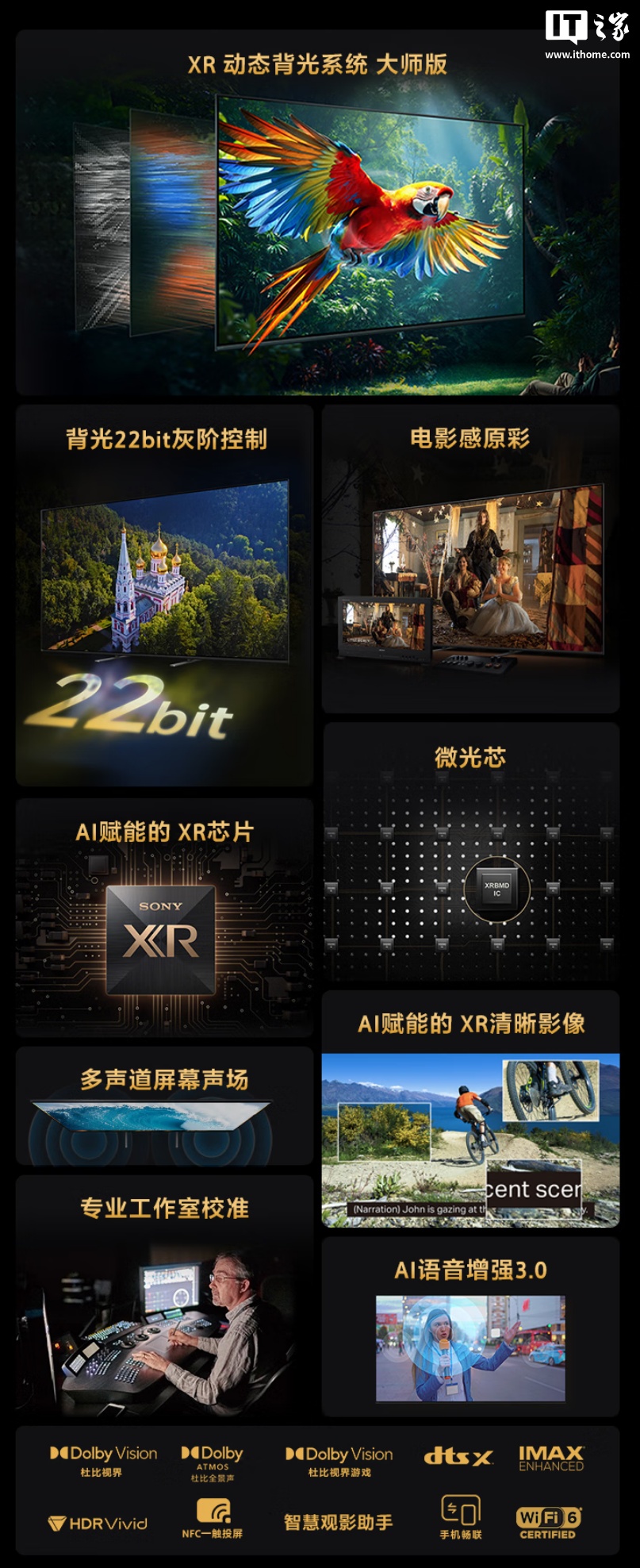 索尼电视 5 系搭载 XR 动态背光系统大师版,支持背光 22bit 灰阶控制,还有杜比视界、杜比全景声等。