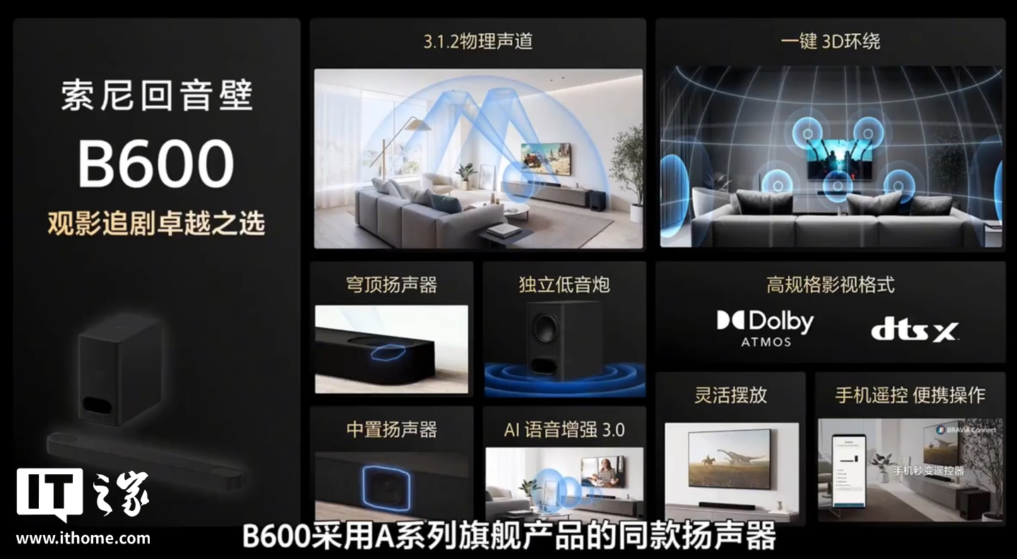 索尼回音壁 B600 搭载 3.1.2 物理声道,配有穹顶扬声器、独立低音炮、中置扬声器,可灵活摆放,一键开启 3D 环绕。