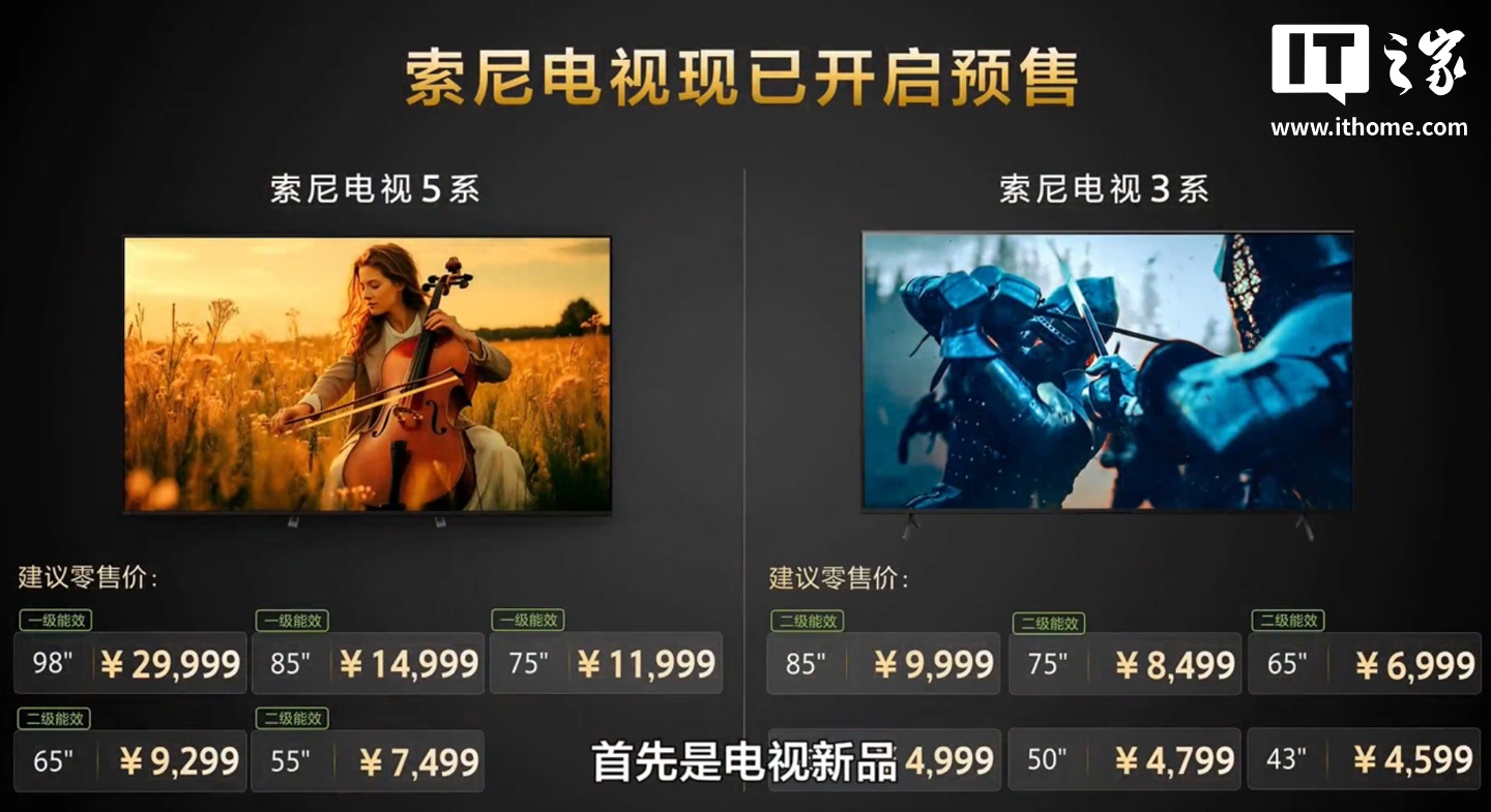 索尼电视 3 系售价 4599 元起,索尼电视 5 系售价 7499 元起,现已开启预售。