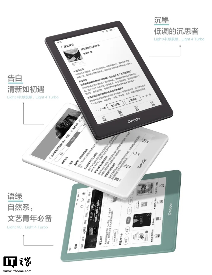 iReader Light 4 系列包括 Light 4C、Light 4 Turbo、Light 4 长续航版三款,可选沉墨、告白、语绿配色。