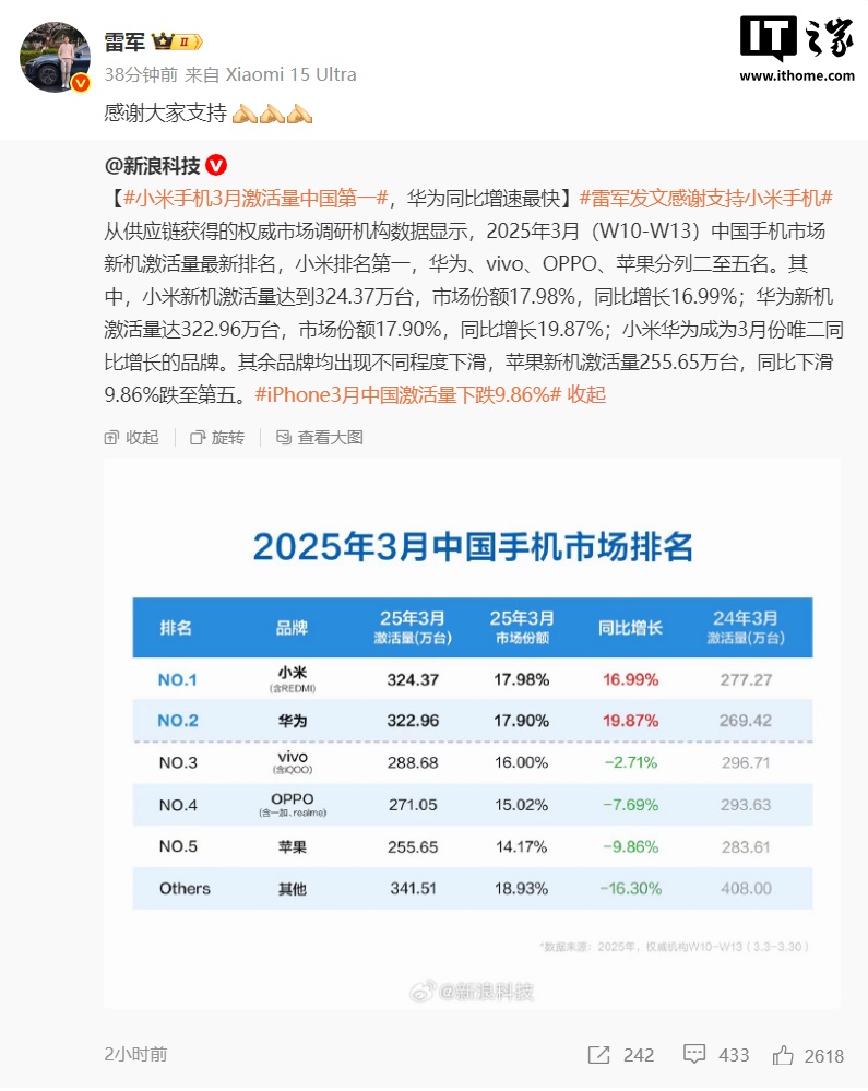 IT之家 4 月 15 日消息,据新浪科技今日报道,从供应链获得的权威市场调研机构数据显示,2025 年 3 月(W10-W13)中国手机市场新机激活量最新排名,小米排名第一,华为、vivo、OPPO、苹果分列二至五名。