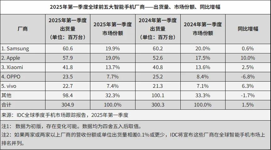 C114讯 4月16日消息(九九)国际数据公司(IDC)发布的最新《全球季度手机跟踪报告》初步数据显示,2025年第一季度全球智能手机出货量同比增长1.5%,达到3.049亿部,大部分头部智能手机厂商实现同比增长。得益于中国政府去年推出、并于今年1月扩展到智能手机领域的补贴政策,中国厂商在国内市场表现突出。