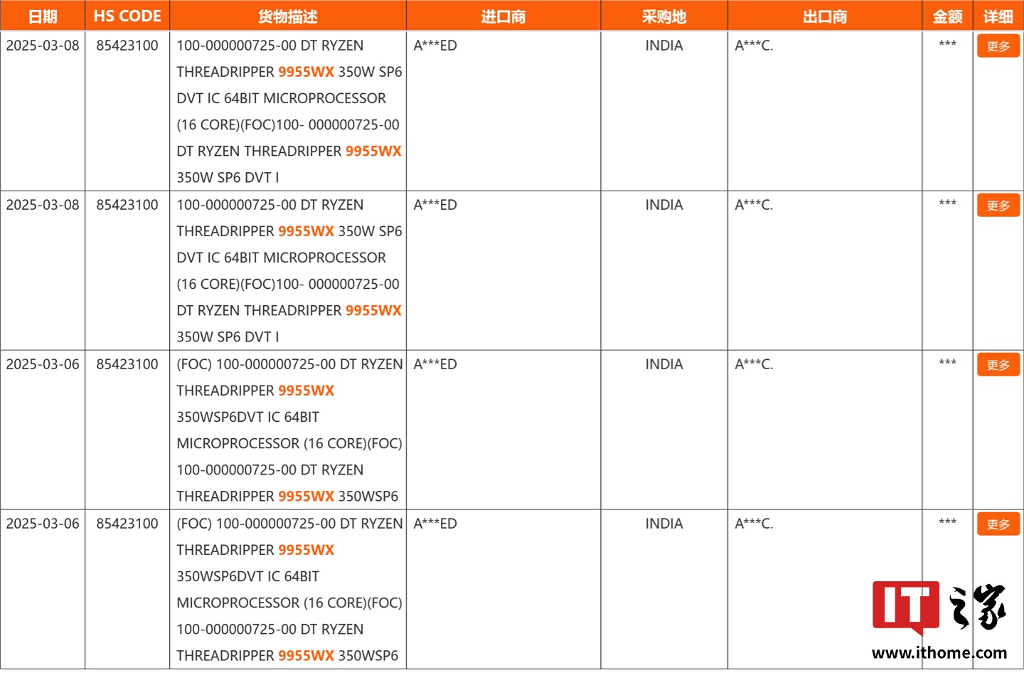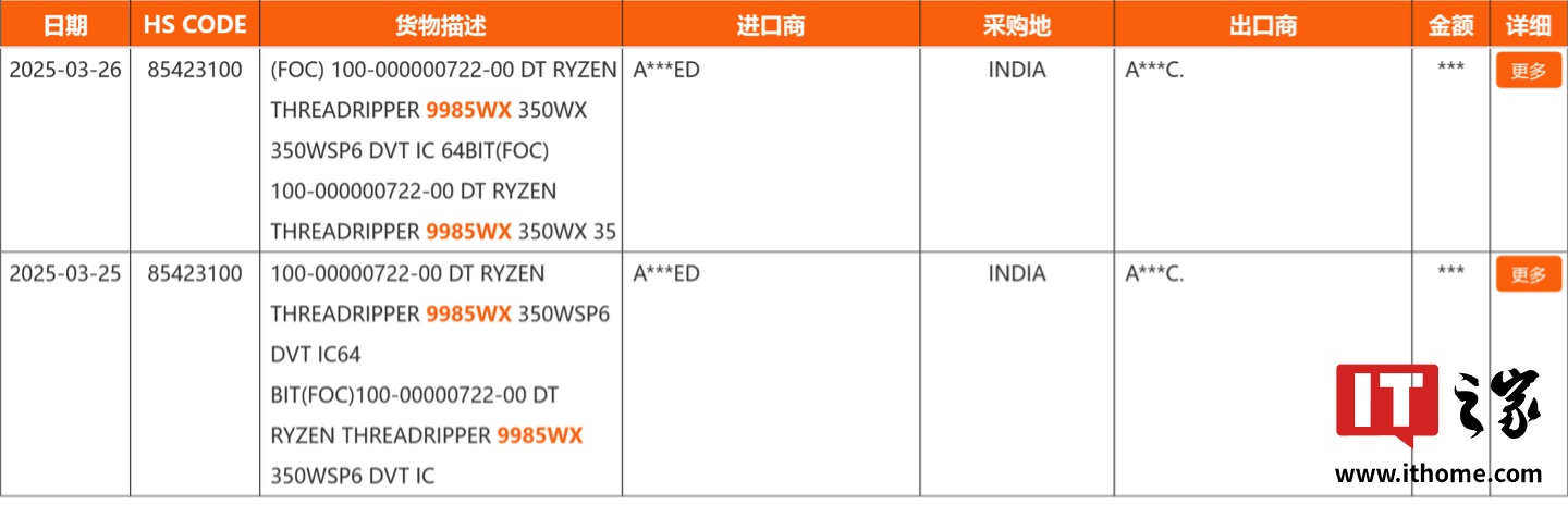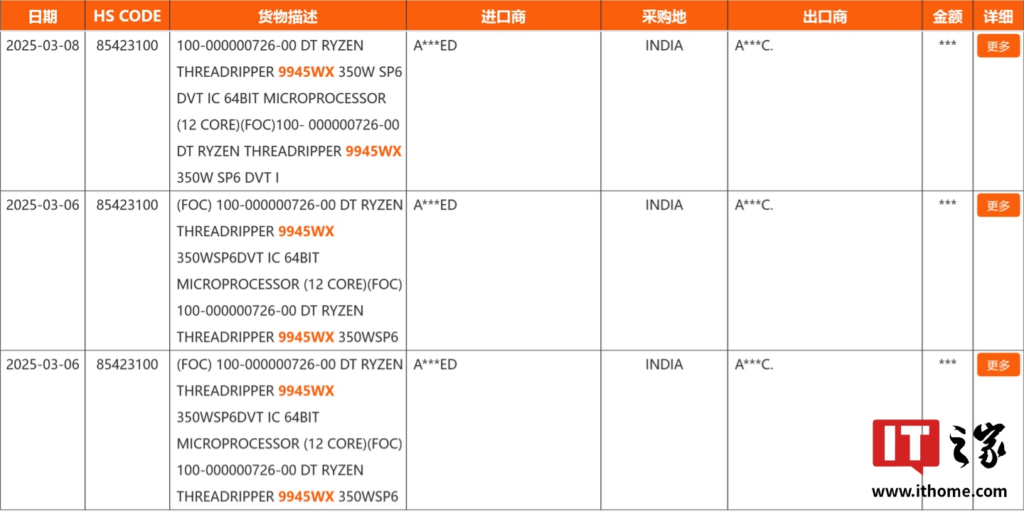 IT之家 4 月 19 日消息,X 平台消息人士 Everest (@Olrak29_) 北京时间昨晚的动态显示,第三方海关信息平台 NBD 纽佰德出现了有关 AMD 锐龙 Threadripper PRO 9945WX / 9955WX / 9985WX 处理器的记录。