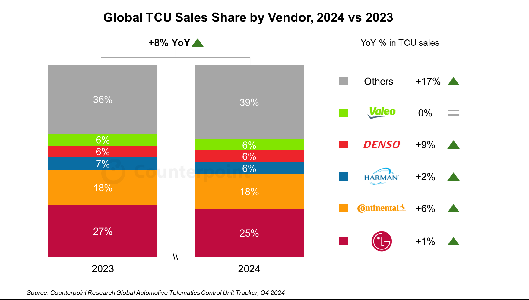 近日,市调机构Counterpoint Research在报告中指出,随着嵌入式互联互通日益成为乘用车的标配,全球远程信息处理控制单元(TCU)市场在2024年继续扩张,同比增长8%。