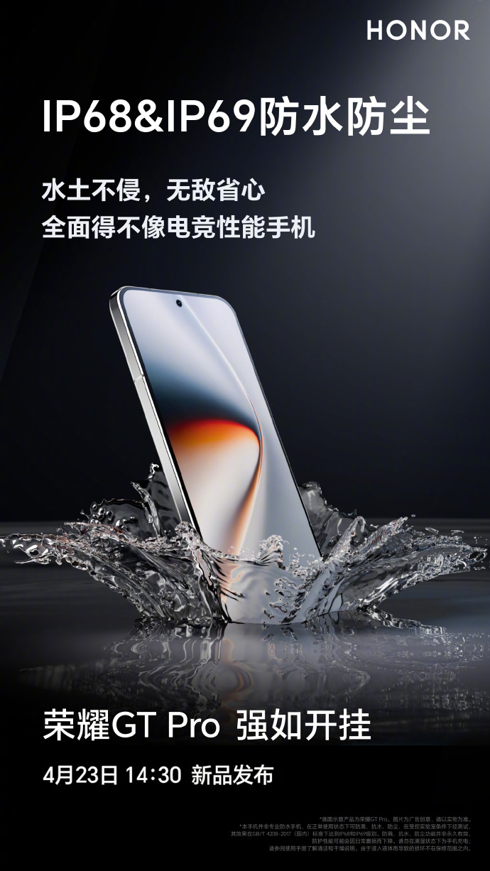 IT之家 4 月 19 日消息,荣耀 GT Pro 手机将于 4 月 23 日 14:30 发布,新机搭载 IP68 & IP69 防水防尘。