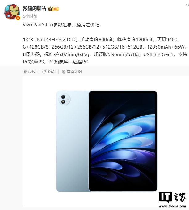 IT之家 4 月 19 日消息,vivo Pad5 Pro 平板将于 4 月 21 日 19:00 发布,新机搭载天玑 9400 处理器,同时内置 12050mAh 电池。今日,博主 @数码闲聊站 曝光了这款新机的主要参数。