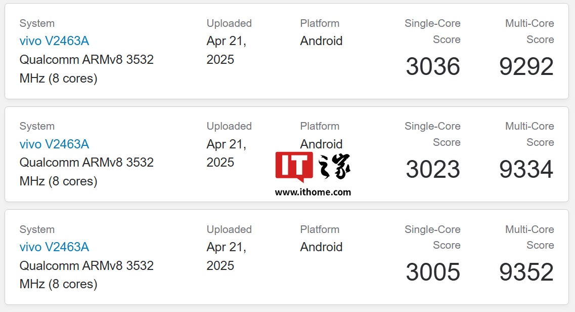 IT之家 4 月 22 日消息,型号为 V2463A 的 vivo iQOO 设备通过中国 3C 和 CMIIT 平台认证,此外现身 GeekBench 跑分库,6.3.0 版本单核成绩为 3005 分,多核成绩为 9352 分。