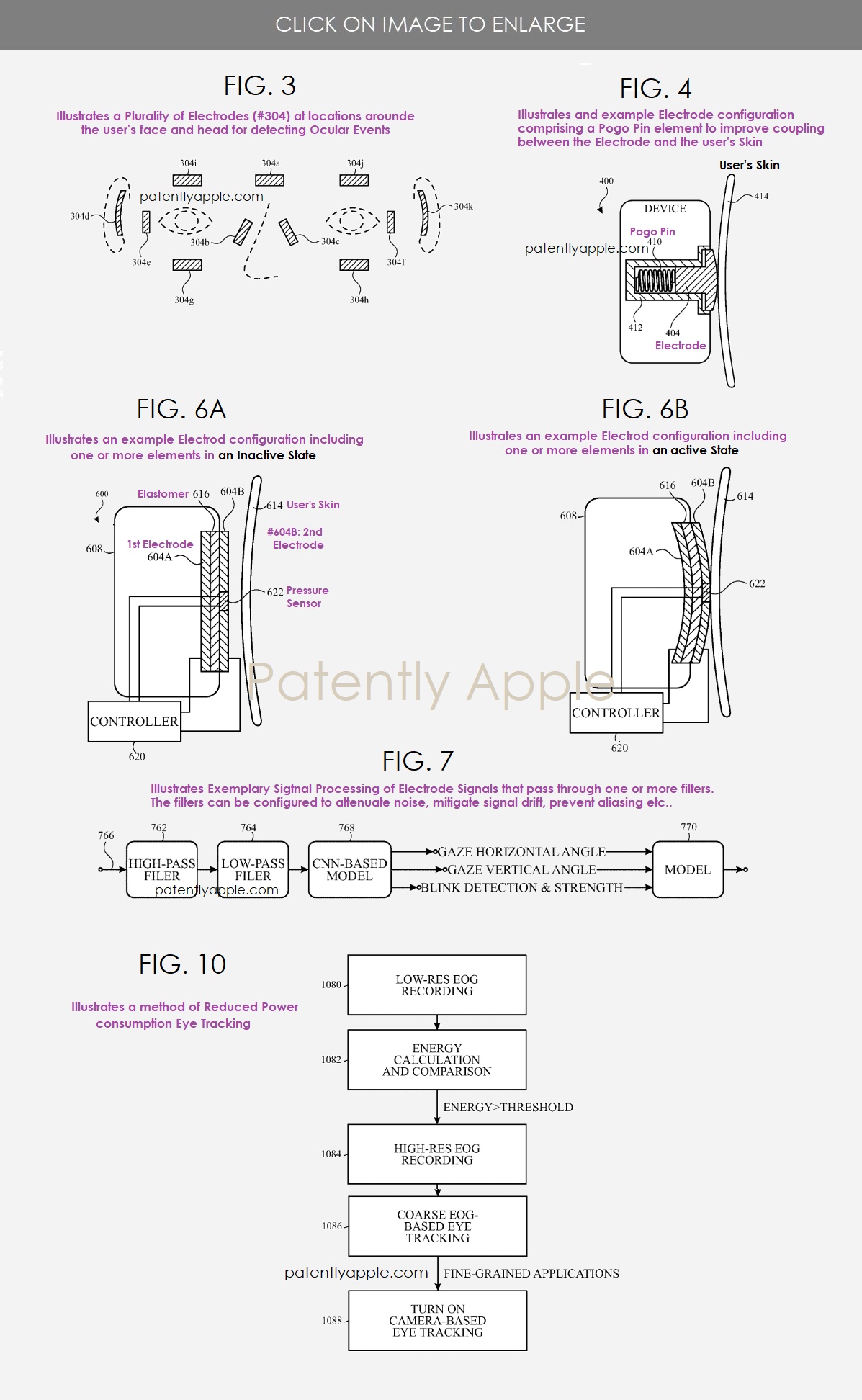 该专利采用电眼图(EOG)传感器,能够测量眼球角膜与视网膜间的电压差,捕捉眼部活动信号。此外,电极还可作为脑电图(EEG)或肌电图(EMG)传感器,分别检测用户大脑或眼部肌肉的电活动。