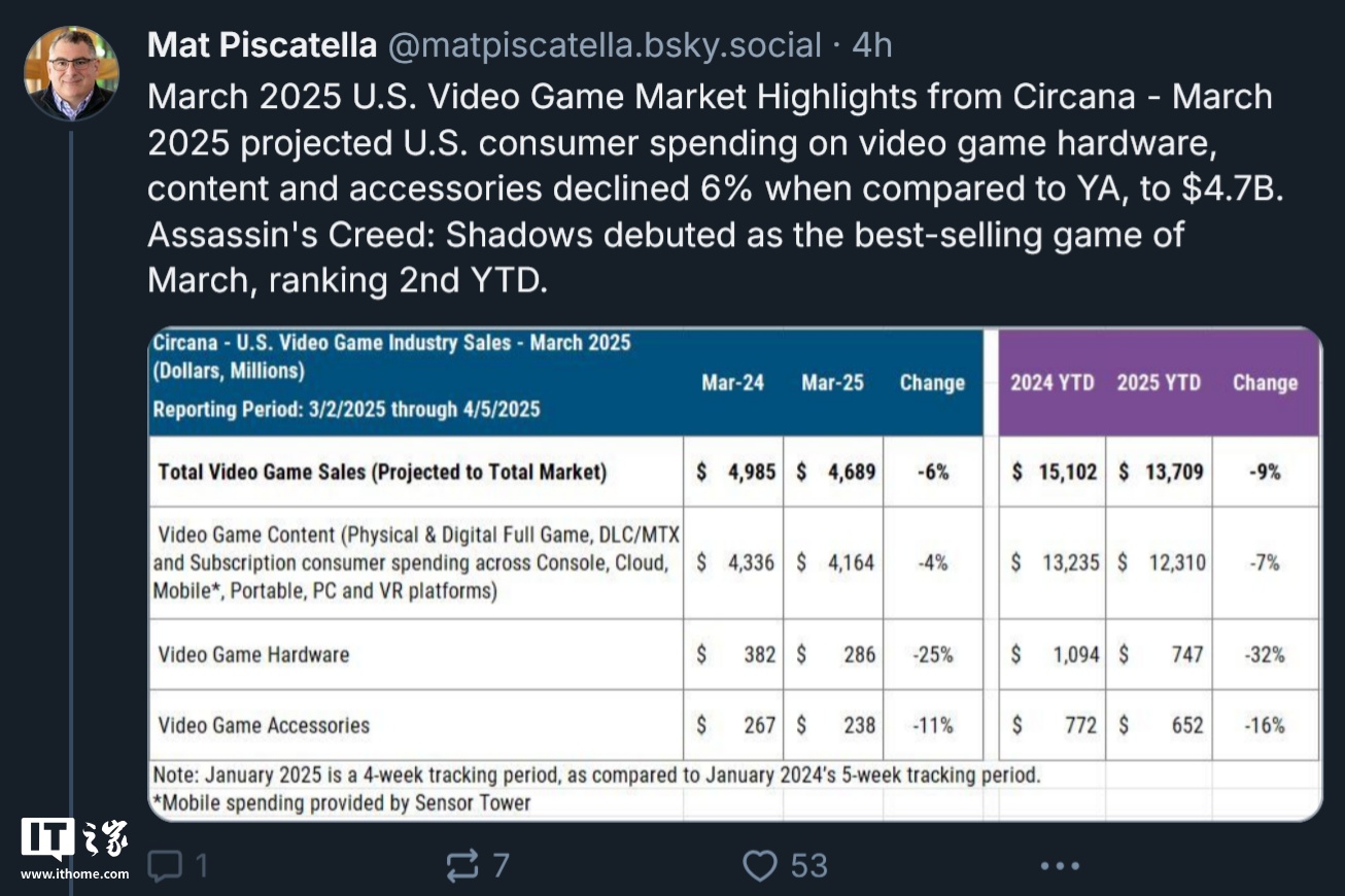 尽管多款跨平台大作同期上市,游戏行业三月表现仍显黯淡。市场研究机构 Circana 分析师 Mat Piscatella 披露,三月份美国主机销售额同比出现 25% 的显著下滑: