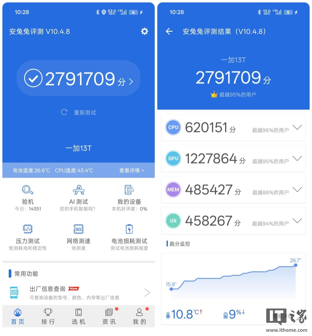 安兔兔跑分中,一加 13T 拿下了近 280W 左右的分数,跑分表现非常出色,可谓是“小身材大能量”。