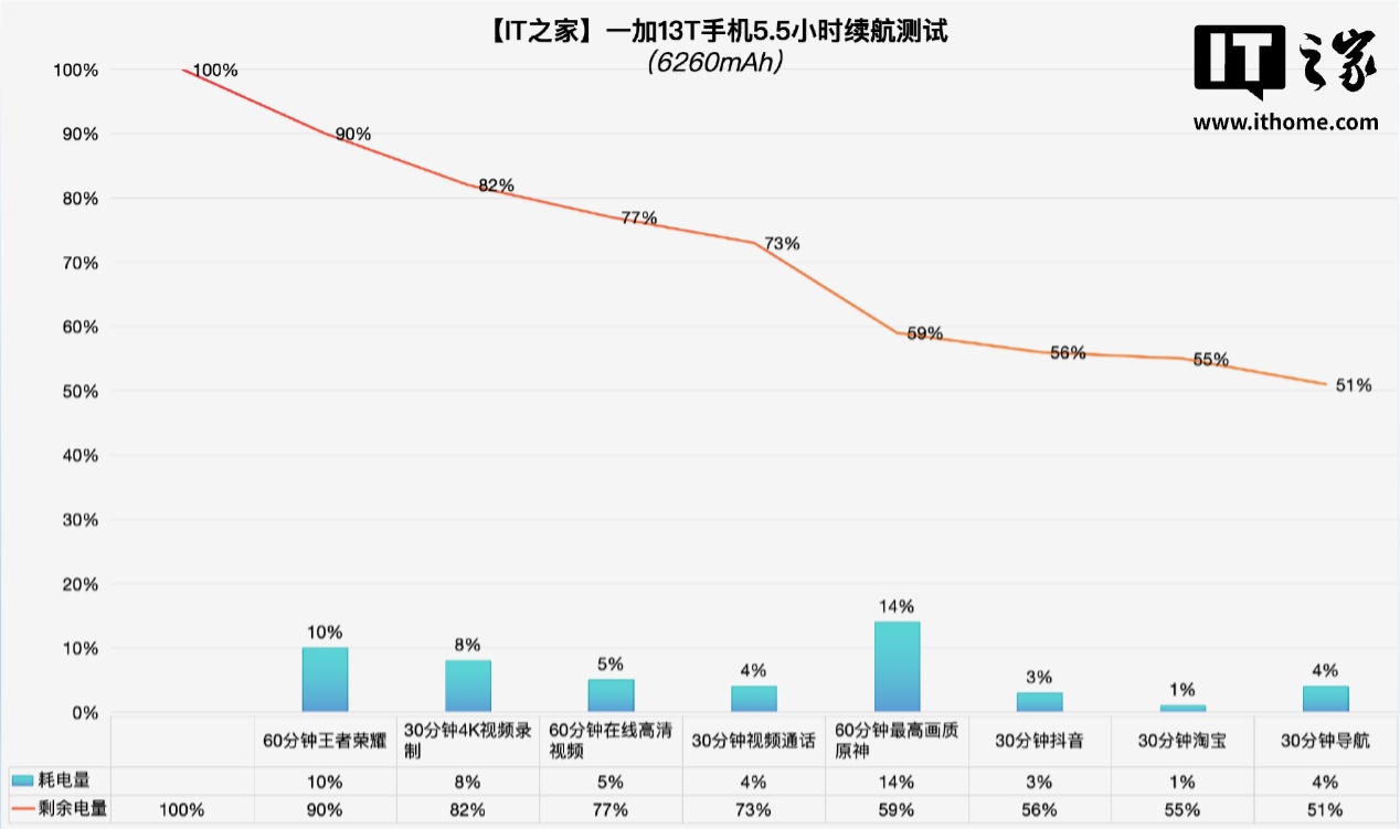 5.5 小时综合续航测试模型下,一加 13T 共耗电 49%。