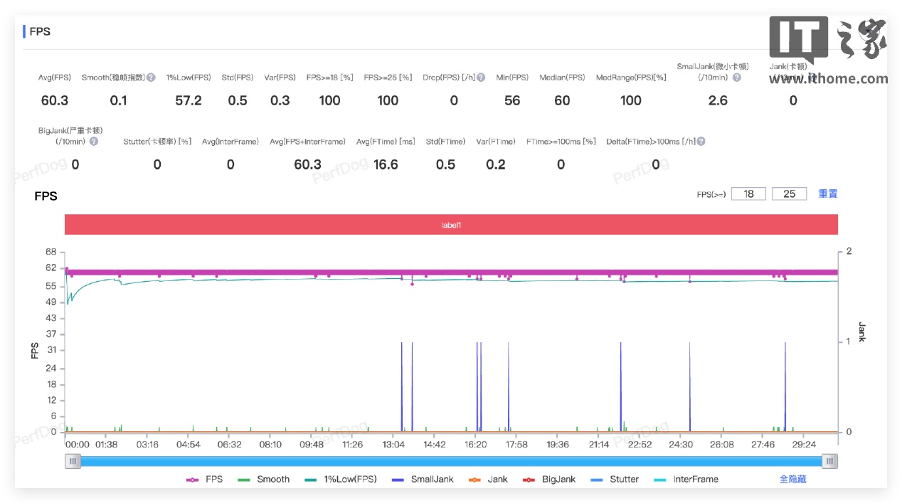 如下图所示,30 分钟的测试中,一加 13T 拿下了满帧的成绩,帧率曲线非常稳定。