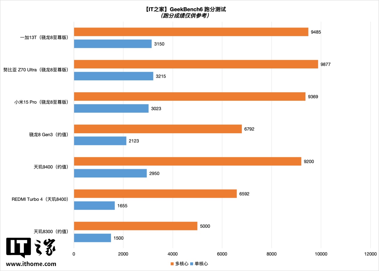 GeekBench 6 的跑分实测中,一加 13T 取得了单核心 3150 分和多核心 9485 分的成绩。对比来看,一加 13T 的跑分成绩可以说是同档小屏旗舰中的 T0 档位了,得益于性能调教优势,单核分数甚至媲美部分调教激进的性能手机。