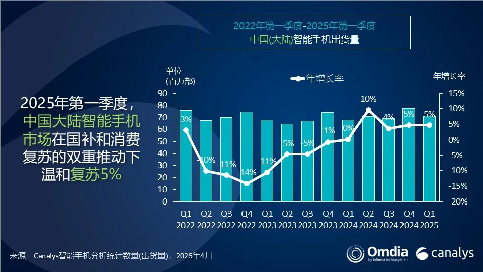 IT之家 4 月 27 日消息,科技市场分析机构 Canalys 今日发布的最新数据显示,2025 年第一季度,中国智能手机市场出货量达 7090 万部,受到国家补贴政策提振及消费复苏推动,同比温和增长 5%,延续了自 2024 年开启的复苏趋势。