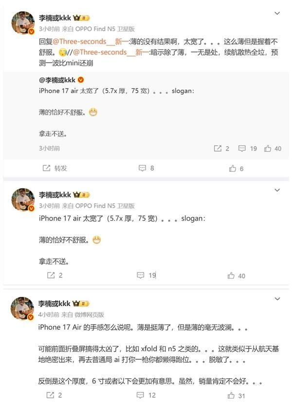 他强调,iPhone 17 Air做薄了,但是苹果薄得毫无波澜,75mm太宽了,握着不舒服。