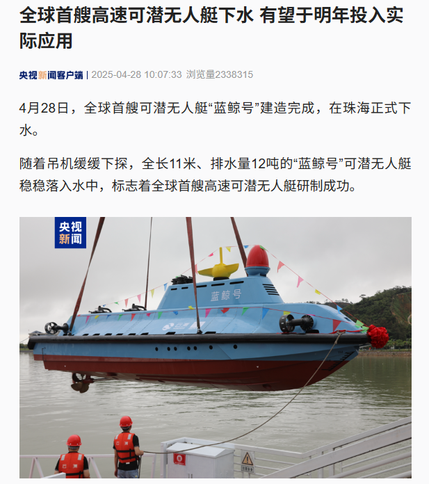 IT之家 4 月 29 日消息,据央视新闻报道,4 月 28 日,全长 11 米、排水量 12 吨的可潜无人艇“蓝鲸号”建造完成,在珠海正式下水,标志着全球首艘高速可潜无人艇研制成功。