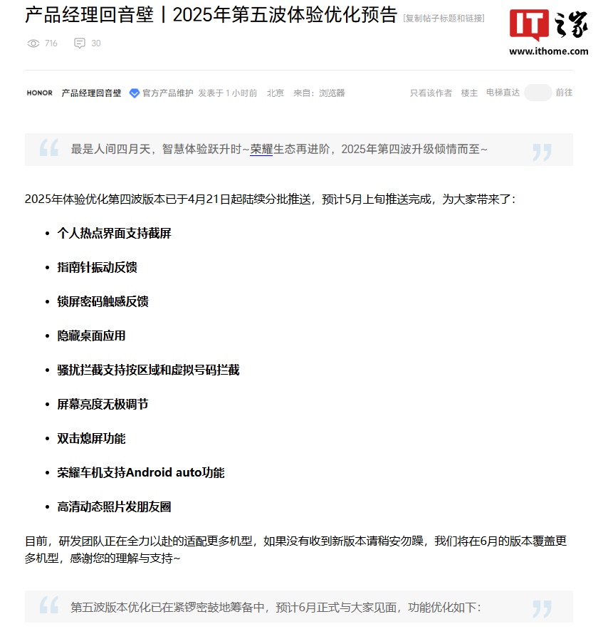 IT之家附荣耀 MagicOS 今年第五波体验优化预告如下: