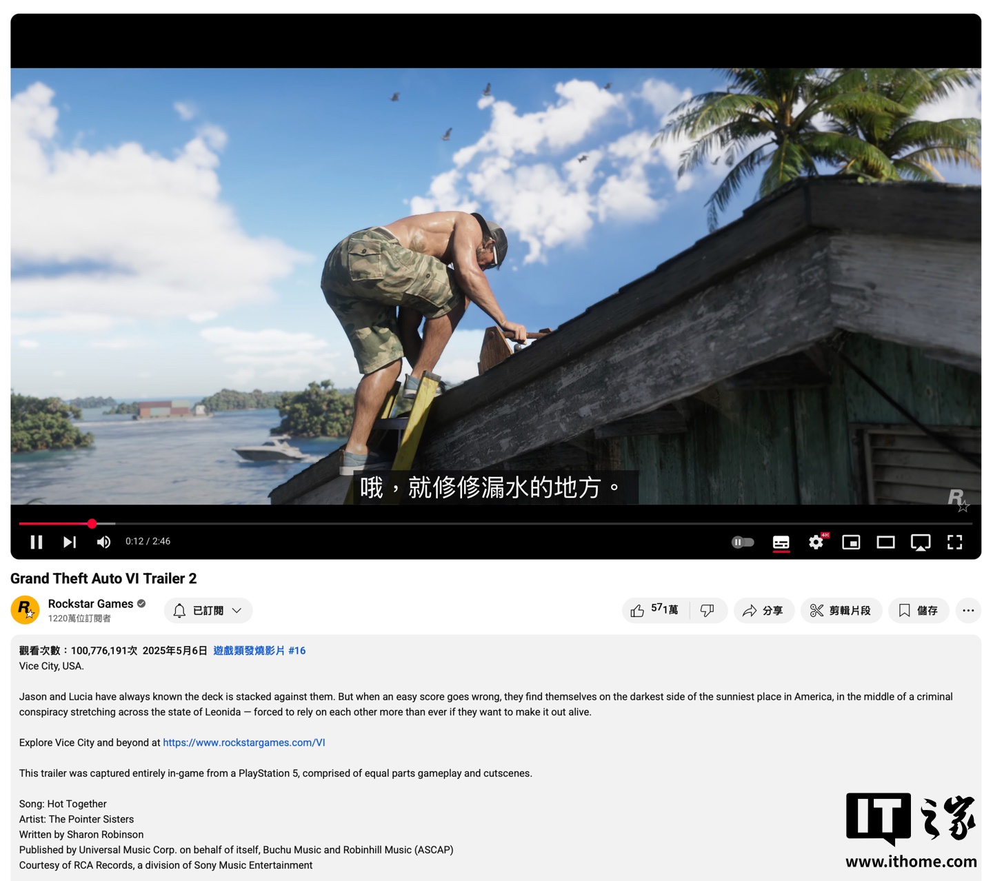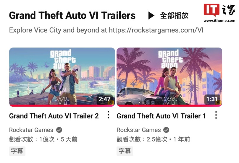 IT之家 5 月 11 日消息,R 星在 5 月 6 日晚上悄悄发布了《GTA6》第二支预告片,目前该预告片在 YouTube 平台播放量已突破 1 亿次,用时 5 天。作为比较,目前《GTA6》第一支预告片在 YouTube 平台播放量为 2.5 亿次。